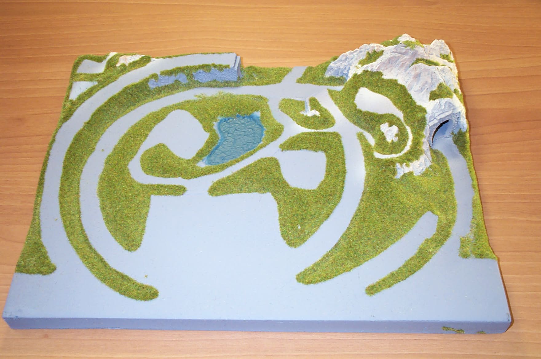 The board is constructed of a rigid foam base and is preformed with rock details, lake, grass, and embankments already finished! All you need to do is add a briefcase or a nice sturdy wood frame! This layout also looks great in a glass-covered conversation table!